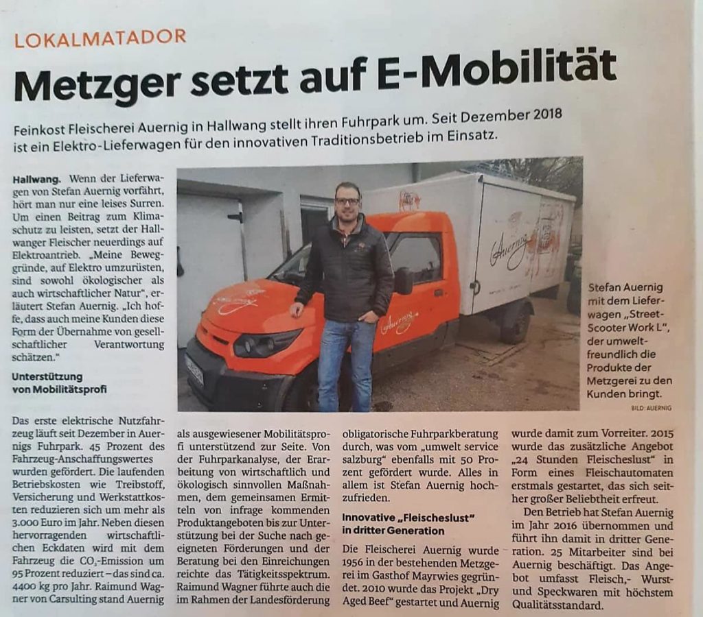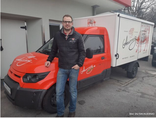 Feinkost Fleischerei Auernig in Hallwang stellt ihren Fuhrpark um. Seit Dezember 2018 ist ein Elektro-Lieferwagen für den innovativen Traditionsbetrieb im Einsatz.
