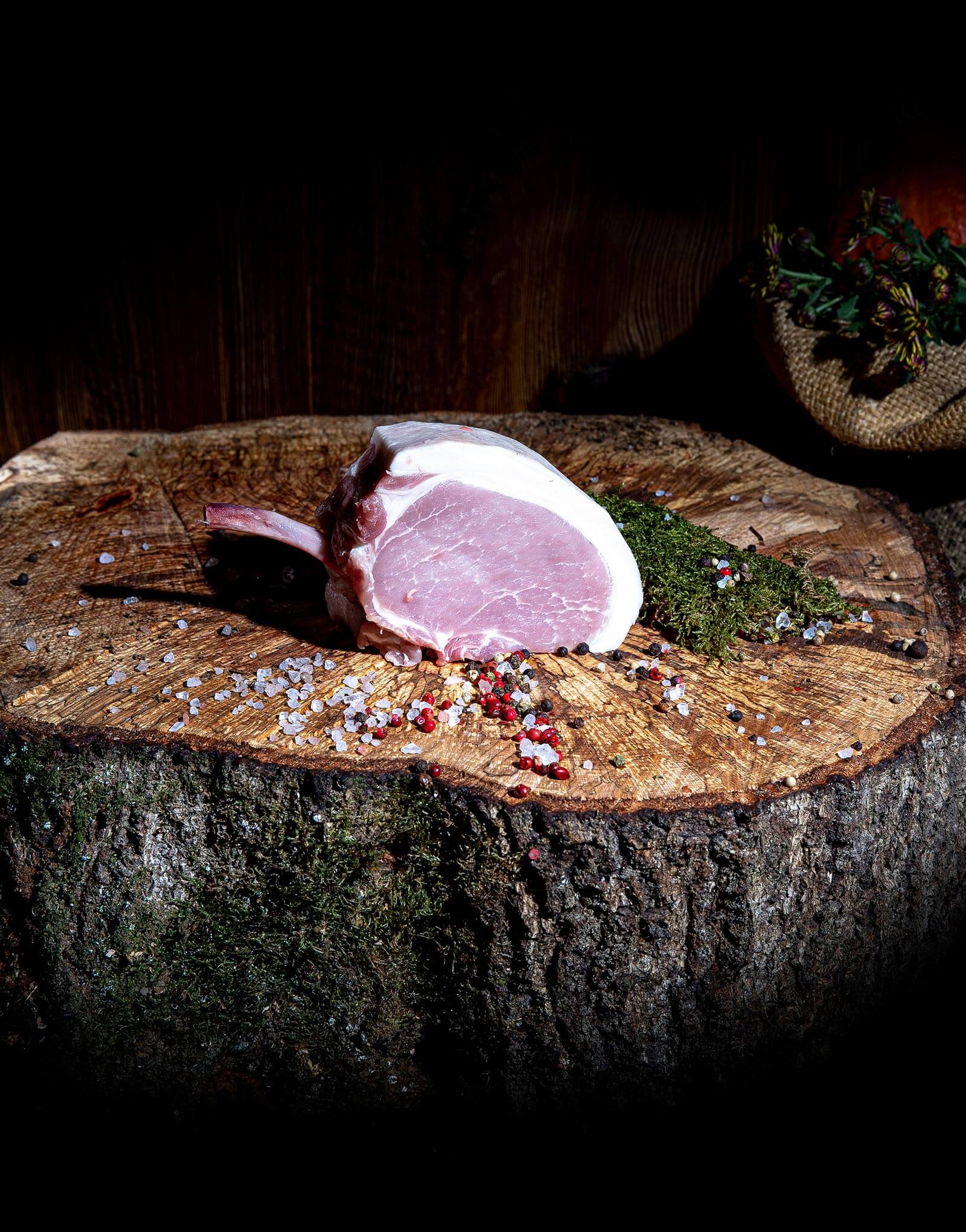 Das Tomahawk wird aus dem Schweinerücken, genau aus dem langen Karree geschnitten. Die Knochen legen wir sorgfältigst frei um ein tolle Stück zu bekommen. Durch die lange Ablagerung ist es zu raten das Tomahawk rosa zu grillen, braten oder garen.